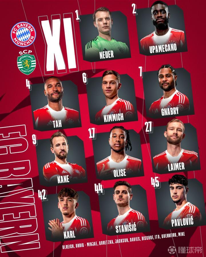 首先,讓我們來看拜仁的首發陣容:1號諾伊爾、44號斯坦尼希奇、2號于帕梅卡諾、4號約納坦-塔、27號萊默爾、42號倫納特-卡爾、45號帕夫洛維奇、6號基米希、7號格納布里、17號奧利塞、9號凱恩!